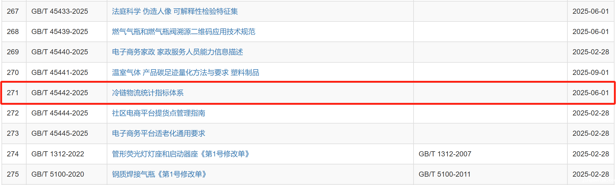 2025年2月28日,国家市场监督管理总局、国家标准化管理委员会批准发布282项国家标准,其中包括由全国物流标准化技术委员会提出并归口的《冷链物流统计指标体系》(GB/T 45442-2025)和《物流企业冷链服务能力要求与评估指标》(GB/T 31086-2025)两项国家标准。